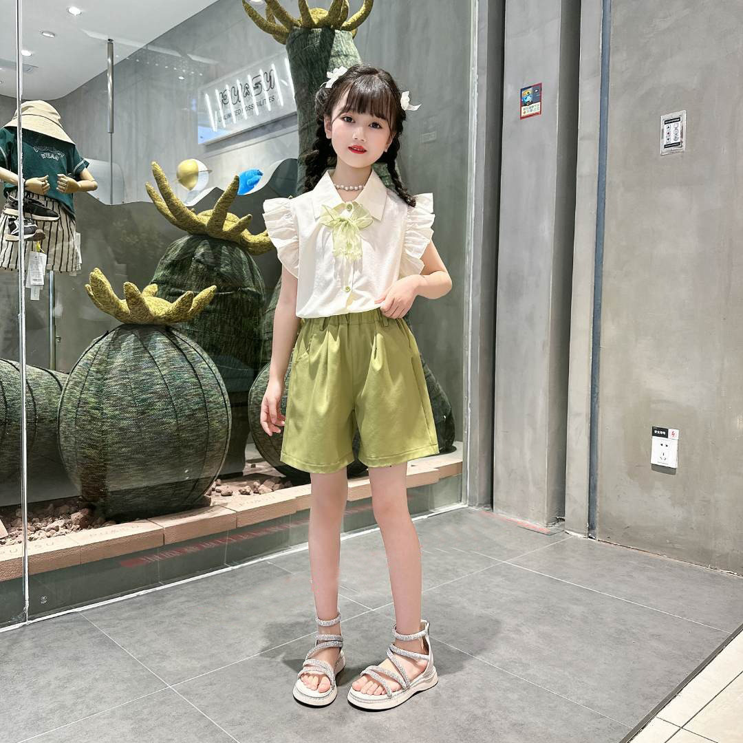 女の子韓国風甘いフライングスリーブスーツ2025夏新作大きな子供用ファッショナブルな綿シャツとショーツの2点セット