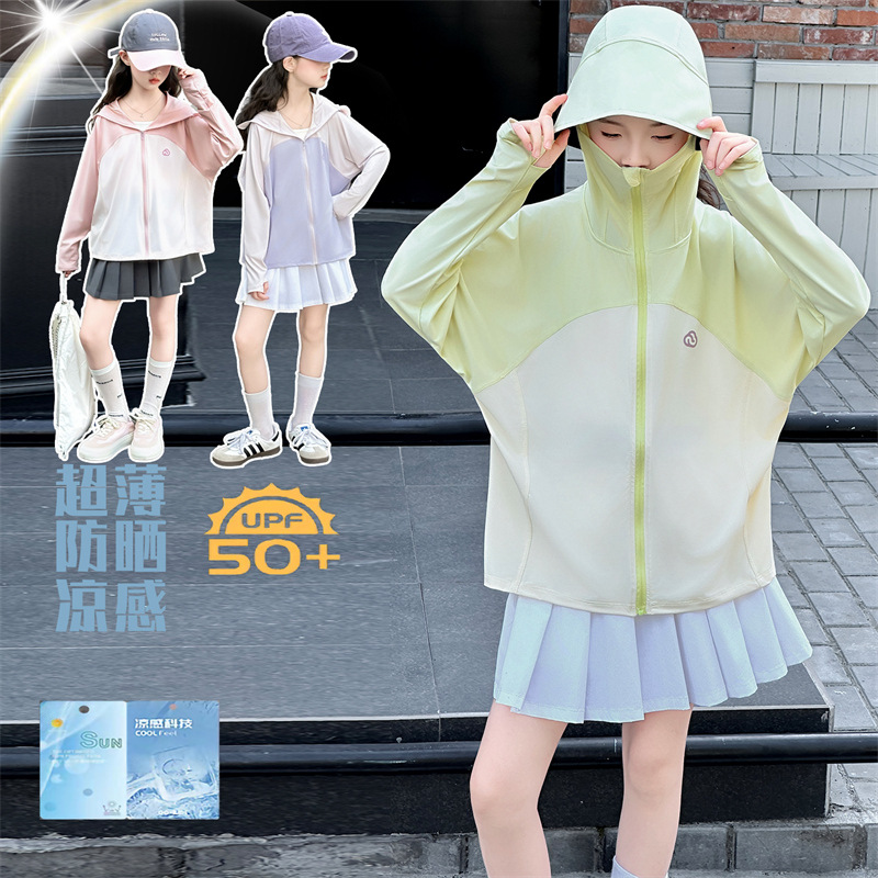 女の子の屋外氷日焼け防止ジャケット 2025 夏の新しい大きな子供のファッショナブルなスタイルのフード付きカラーブロック日焼け防止服
