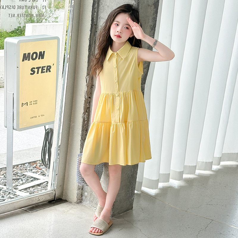 女の子ノースリーブドレス 2025 夏の新しい大きな子供のシャツ襟ベストドレスファッショナブルでクールなスカート
