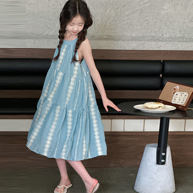 女の子のクールなノースリーブドレス 2025 夏の新しい大きな子供のロングスカートハイエンドレイヤードホリデースタイルビーチドレス