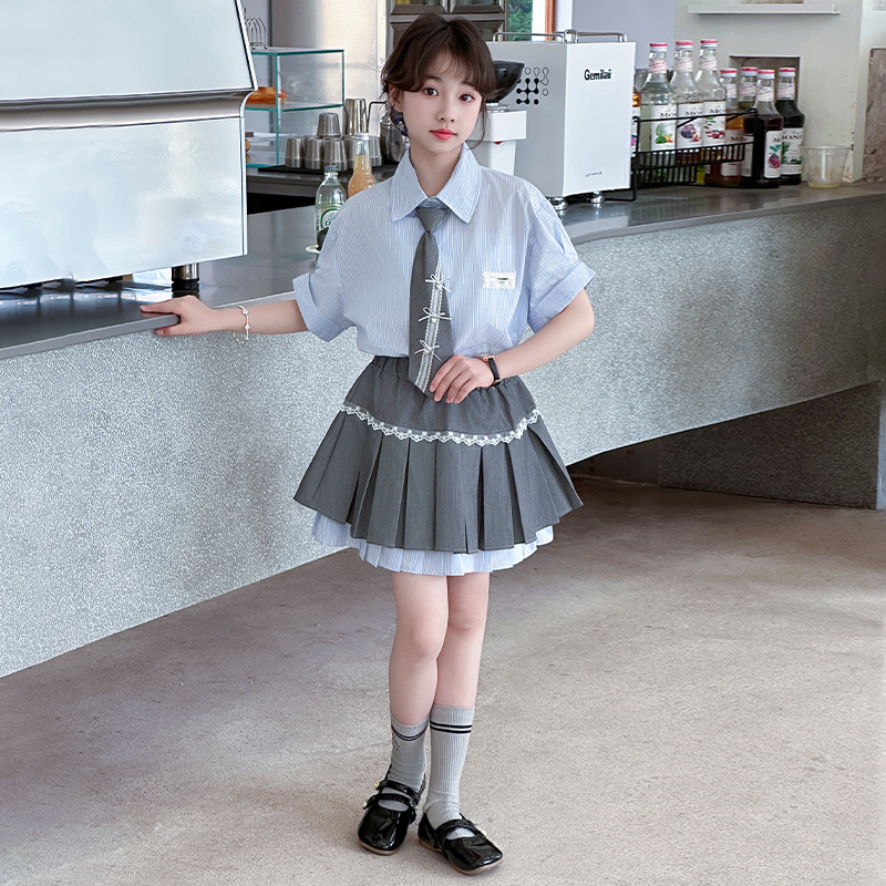 女の子韓国カレッジスタイル JK スーツ 2025 夏の新しい大きな子供のファッショナブルな半袖シャツプリーツスカート 2 点セット