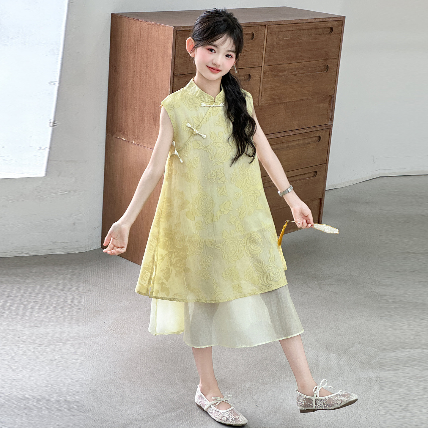 女の子改良チャイナドレス 2025 夏の新しい大きな子供のレトロクールな中国風の新しい中国風の古代スタイルのスカート