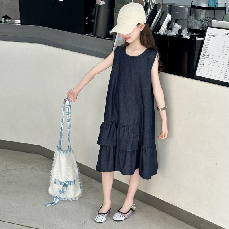 女の子のトレンディな薄いデニムスカート 2025 夏の新しい大きな子供のクールなサマードレス小さな女の子ノースリーブベストドレス