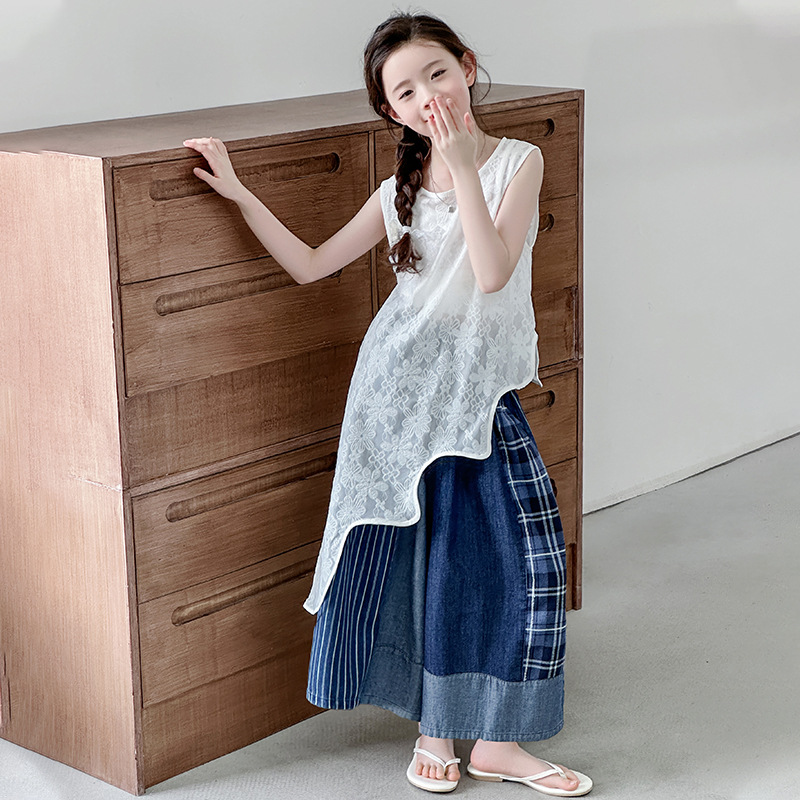 女の子のレースパッチワークドレス 2025 夏の新スタイル中大型子供韓国スタイルノースリーブベストドレス甘いメッシュスカート