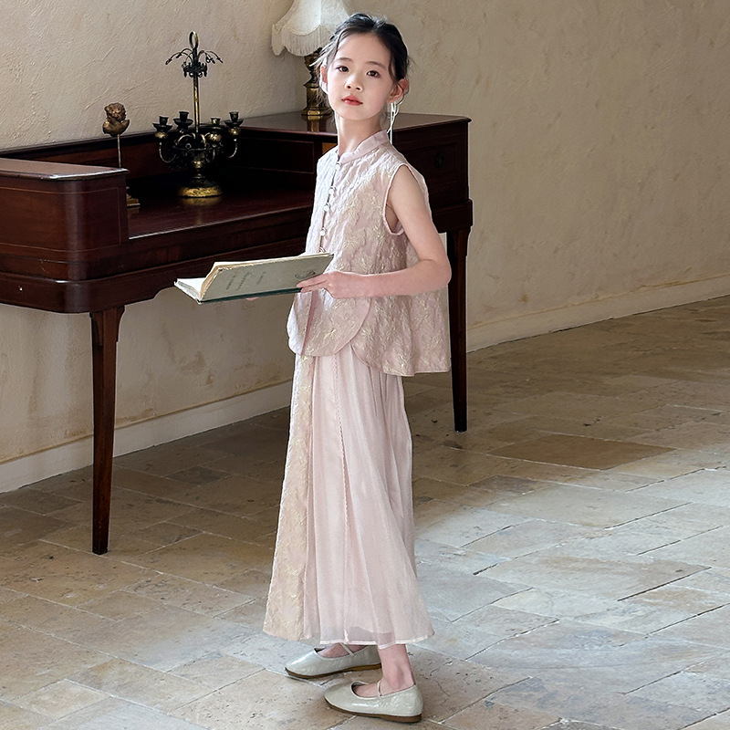 女の子のレトロな新しい中国風スーツ 2025 夏の新しい大きな子供のジャカードノースリーブベストスカート中国風スカート