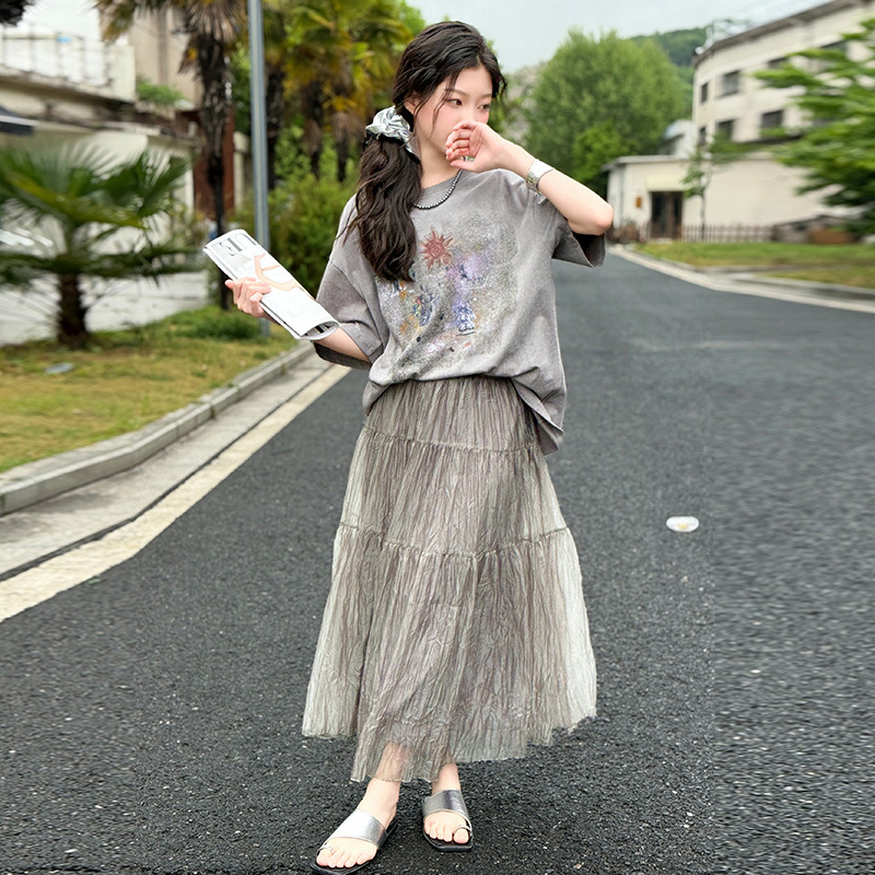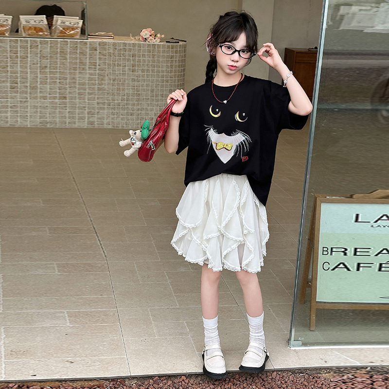 女の子カジュアルスーツ 2025 夏新中大型子供韓国風半袖不規則スカート 2 点セット