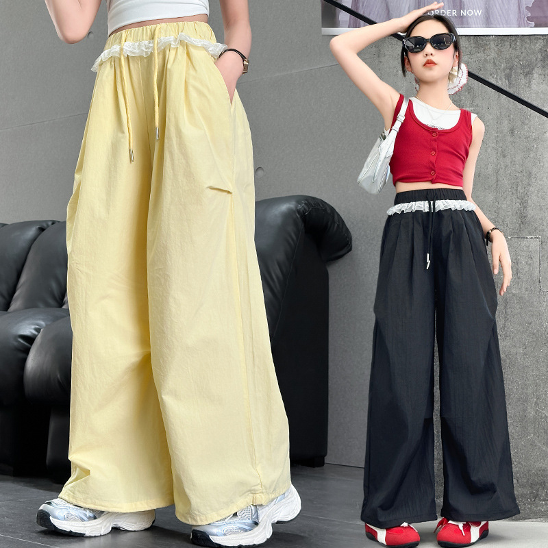 女の子カジュアル速乾ワイドレッグパンツ 2025 夏新作大きい子供薄手クール多用途カジュアルパンツ子供レースパンツ