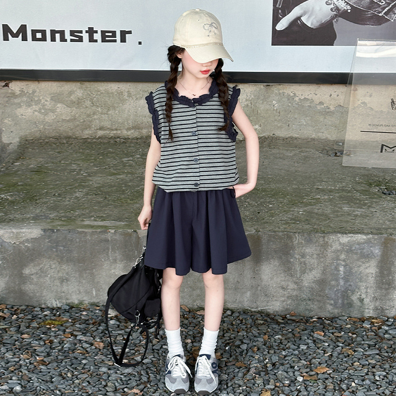女の子の韓国系スーツ2025夏の新型の子供のストライプの袖なしの流行の洋風の半スカートの洋風の2つのセット