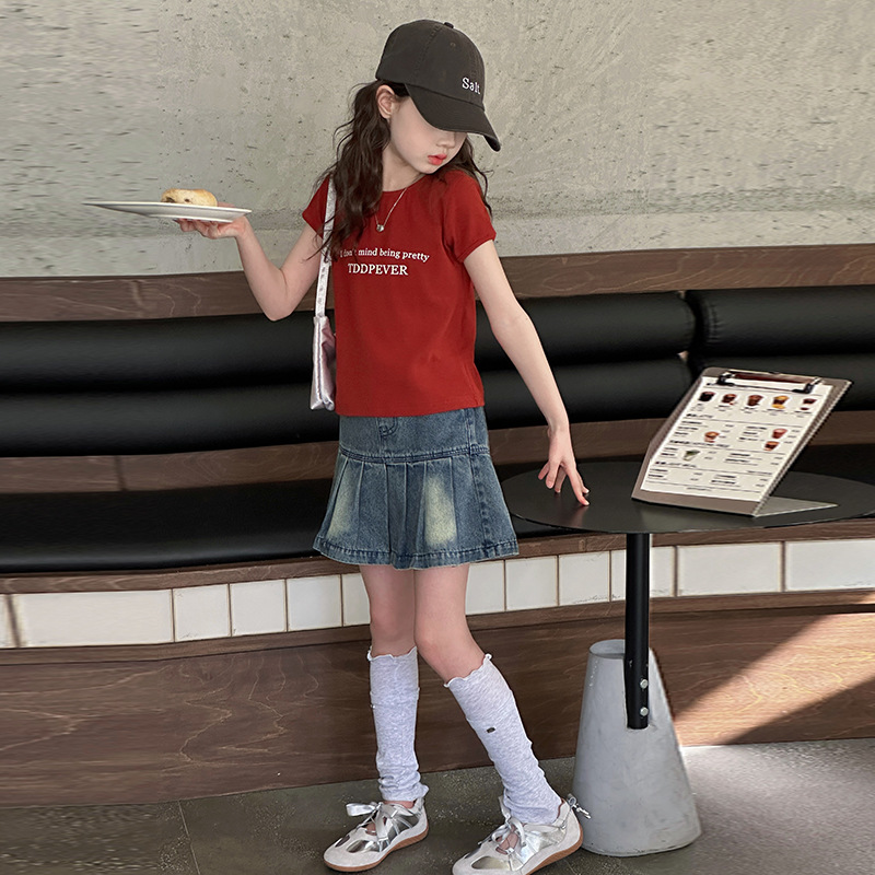女の子の夏のホットガールスーツ2025新しい大きな子供用ファッショナブルな西洋スタイルの右肩スリム半袖ショートスカートツーピーストレンディセット