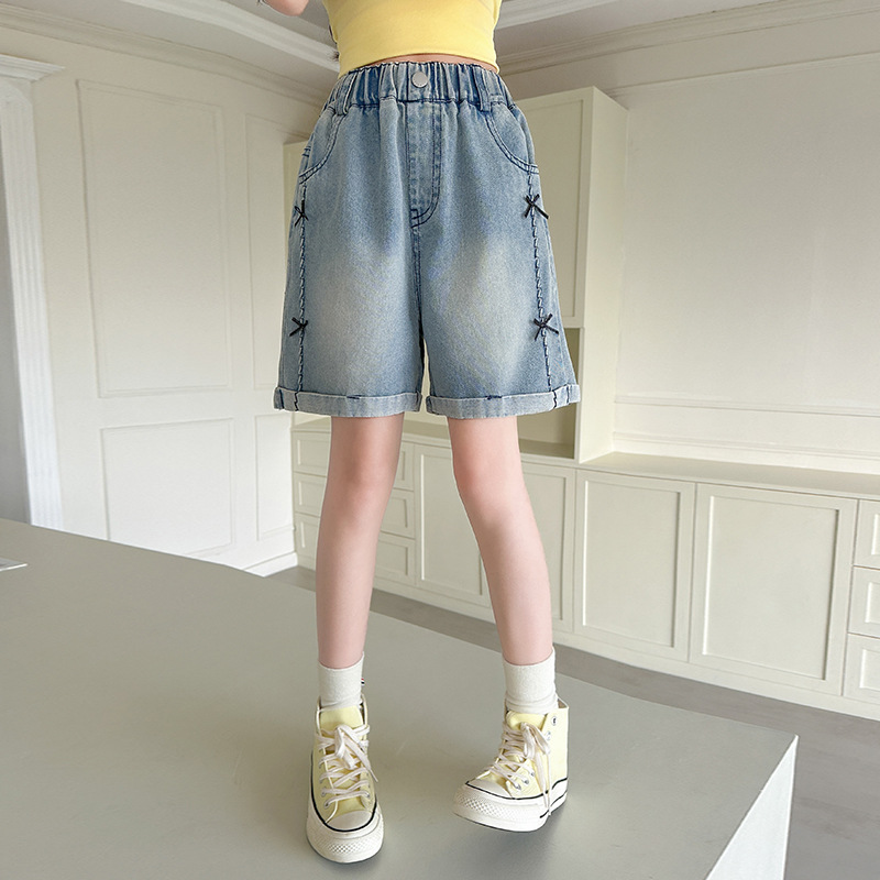 女の子のデニムのショートパンツ2025夏の新型の大きい子供のファッションはカジュアルな蝶結びの4分のズボンの外で熱いズボンを着ます。