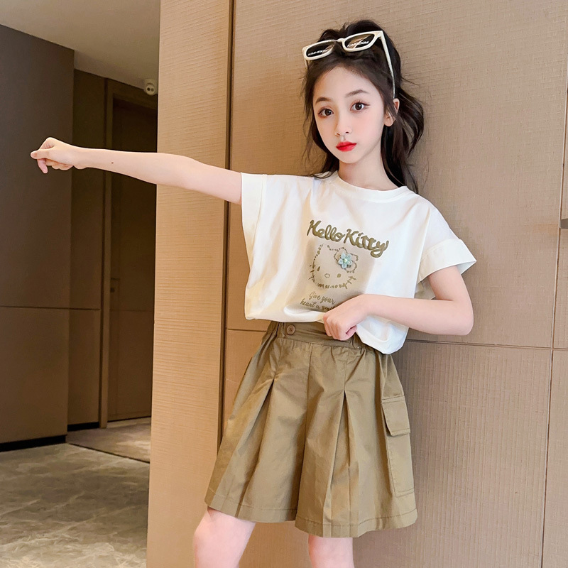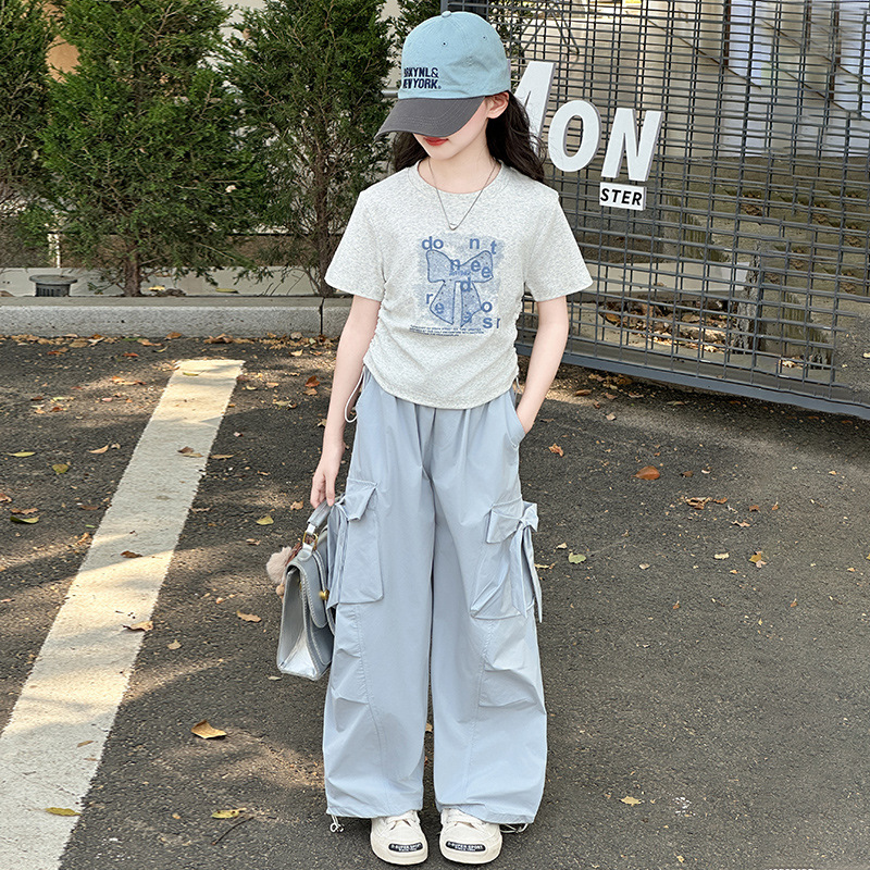 女の子の韓国系セット2025夏の新型子供のファッションの洋風毛玉の子供のシャツの広い足のスカートのズボンの2つのセットのファッション