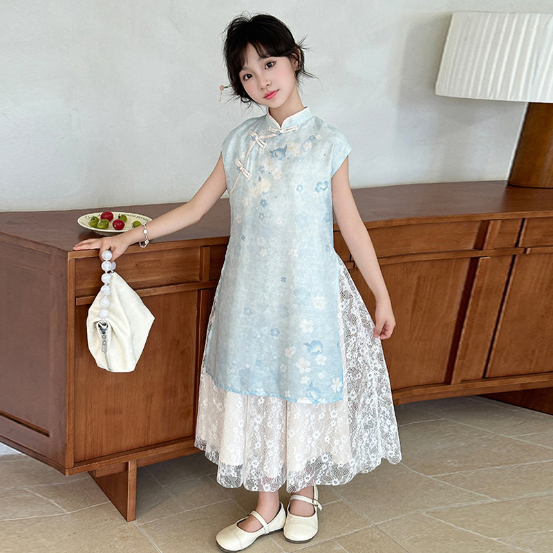 女の子の夏の新しい中国式の古風のワンピース2025新型の大きい子供の袖なしの改良の旗のガウンのスカートの漢服の王女のスカート