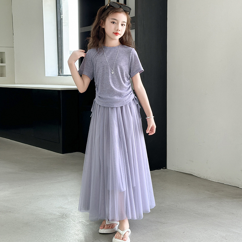 女の子のガーゼのスカートのスーツの2025夏の新型の大きい子供の韓系の流行のひもの半袖の半身のスカートの長いスカートの2つのセットの潮