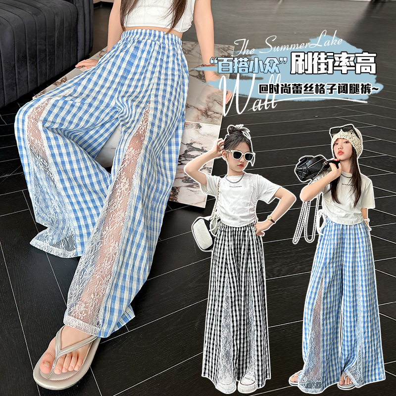 女の子のフレンチレースの格子縞のズボン2025夏の新型の子供の流行の薄い広脚のズボンの防蚊のズボンのズボン