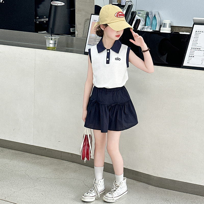 女の子のスカートセット2025夏の新型子供の袖なしpolo上着のスカートの韓国系の流行の2つのセットのファッション