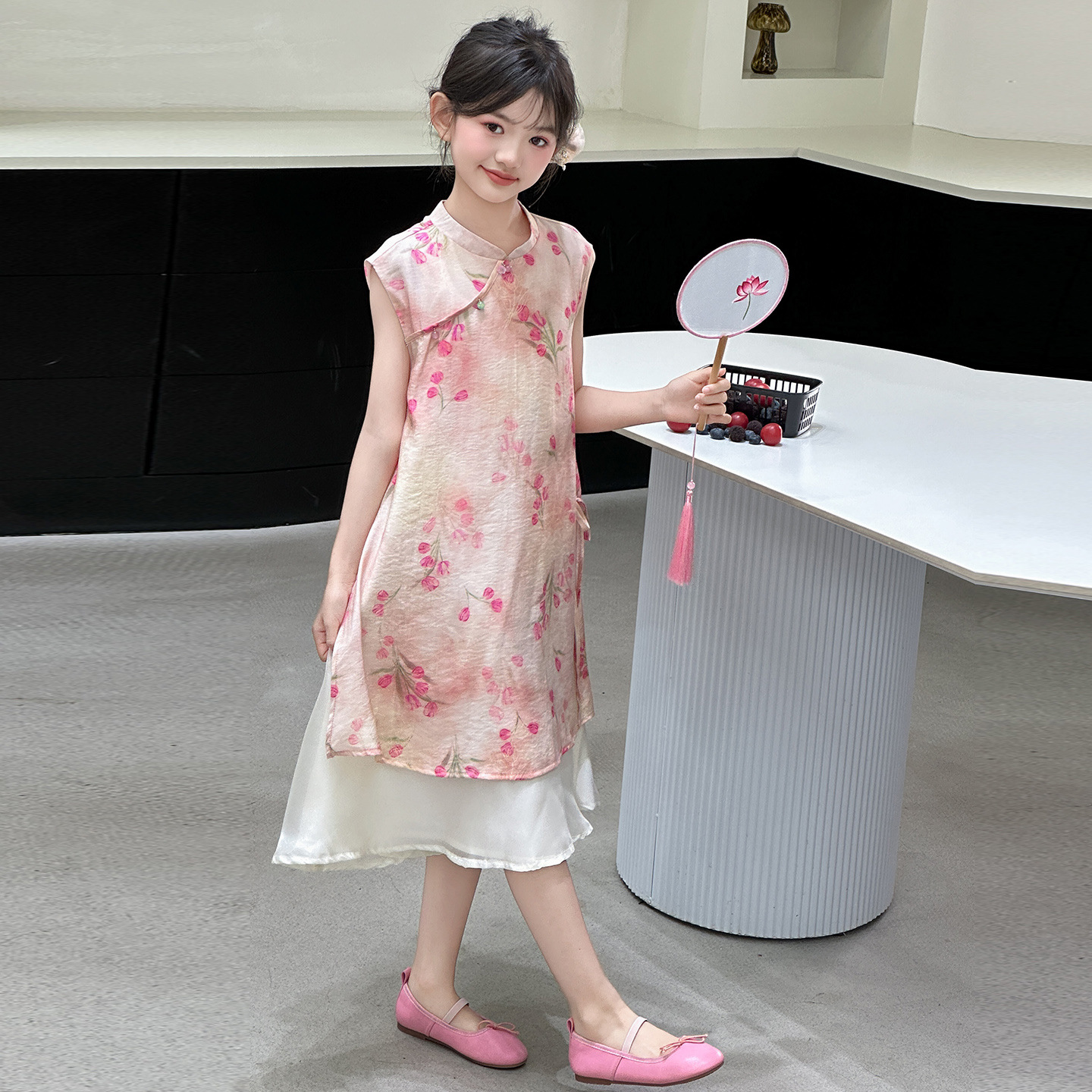 女の子の新しい中国ドレス 2025 夏の新しい大きな子供のノースリーブ中国風レトロ古代スタイルのチャイナドレス改良されたスタイル
