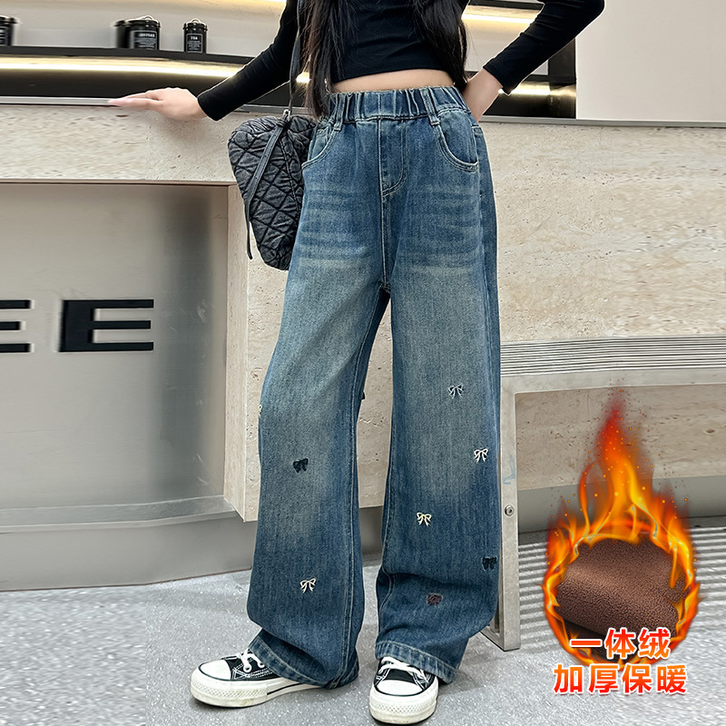 女の子の秋冬のベルベットのジーパンの2024の新型の大きい子供の流行の洋気の刺繍の蝶結びの厚い広足のズボン