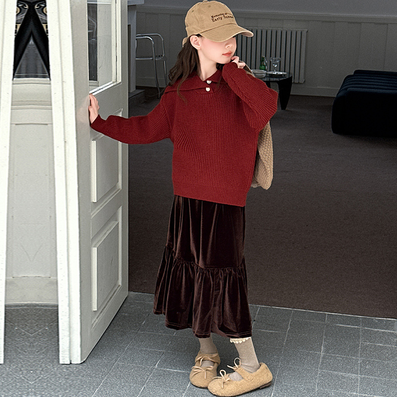 女の子の赤いセーターのニットの秋冬の雰囲気のファッション