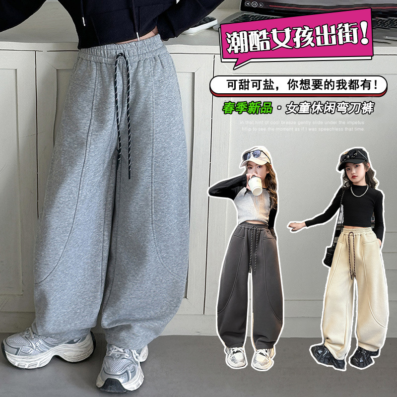 女の子の春秋衛ズボン2025の新型の大きい子供のファッション的な洋風の百合のバナナのズボンとベルベットの厚い運動の広脚のズボン