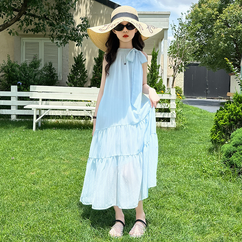 女の子のホルターネックドレス 2025 夏の新しいスタイルの大きな子供のロングスタイルのホリデースタイルのビーチドレス気質ロングスカートトレンディ