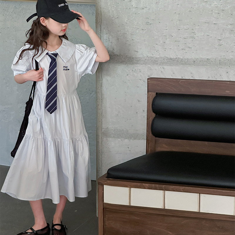 ガールズカレッジスタイルパフスリーブドレス2025夏新作ビッグ子供韓国風シャツドレスガールズスカート