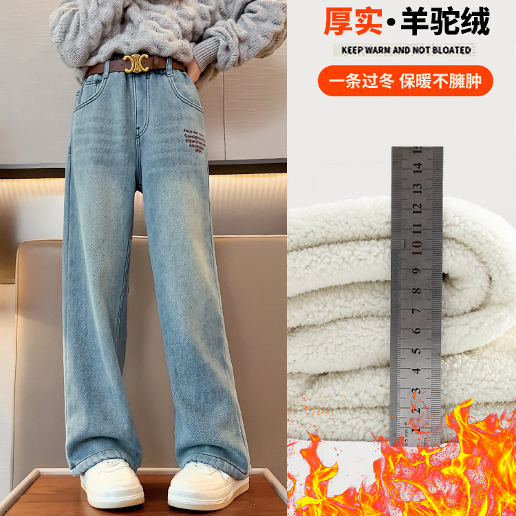 女の子の秋冬とベルベットの厚いデニムのワイドパンツ2024の新しい韓国版の流行の大きい子供のズボンの羊のキャメルケースのズボン
