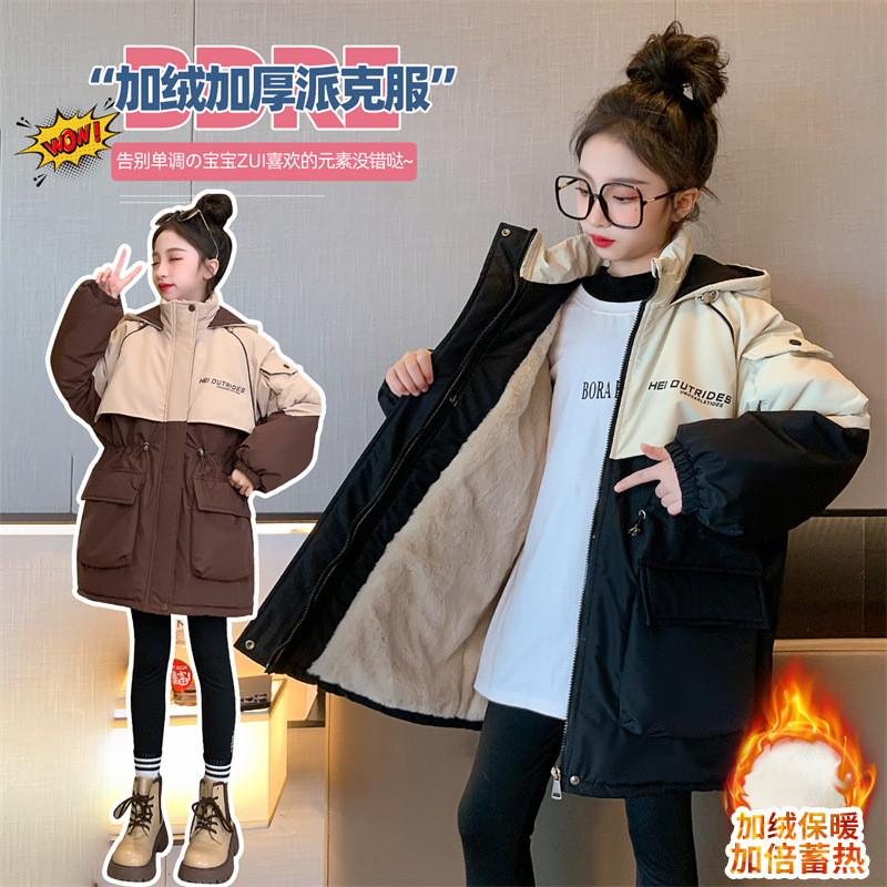 女の子の冬服にベルベットをつけてパーカー服を厚くして2023年の新しい子供の韓国版カジュアルスーツに綿の服を挟んで前線服を着た