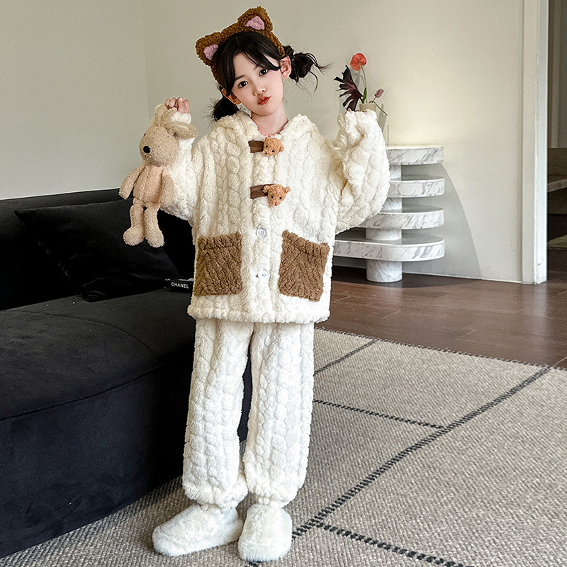 女の子の外にサンゴのベルベットの家の服のスーツを着て、2024冬の新しい流行の洋風の中で子供のかわいいアニメパジャマを着ています