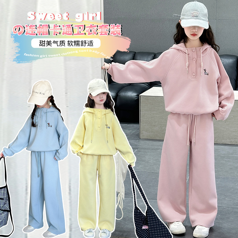 ガールズスーツ春2025新作中大童洋気レジャースポーツ刺繍漫画フード付きスウェット2点セット