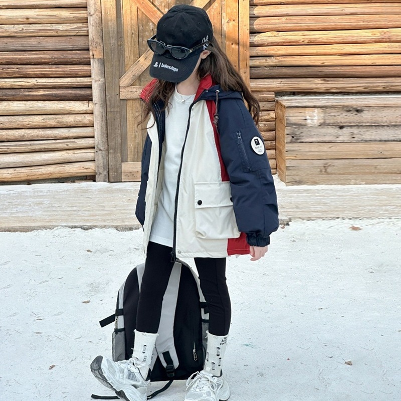 女の子用冬服、カラーブロックフード付きダウンジャケット、2025年新作、おしゃれな白ダックダウン、厚手のジャケット、トレンディなアウター