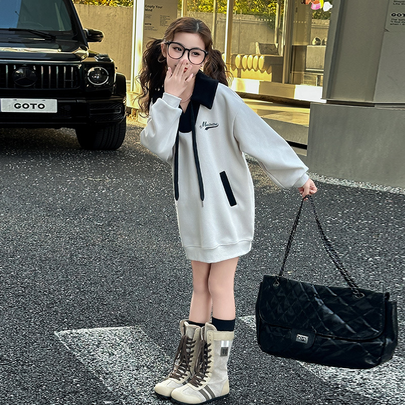 女の子の春秋のワンピース2025の新型の大きい子供の流行の洋風のカジュアルなパーカーのスカートのファッション的な長袖のスカートの潮