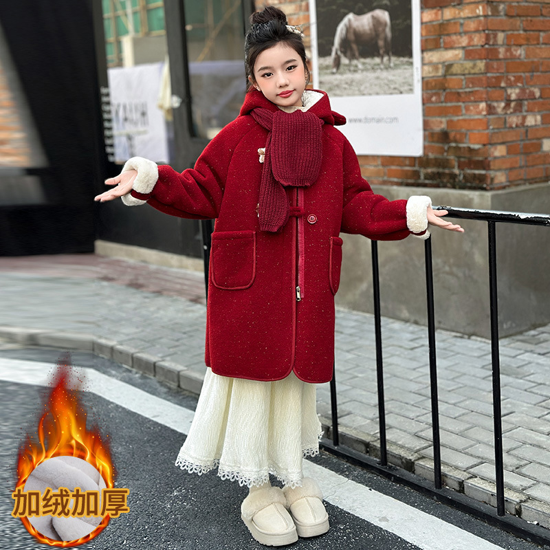 女の子の冬服にベルベットをつけて、年服のコートを厚くして、子供の赤い保温と帽子のフードの年用品のコートを作った