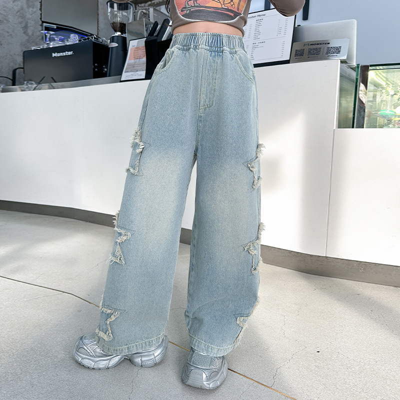 女の子の五芒星のジーパン2025春秋の新型の大きい子供のファッションの洋風の百合の広い足のズボンのゆったりしているカジュアルなズボン