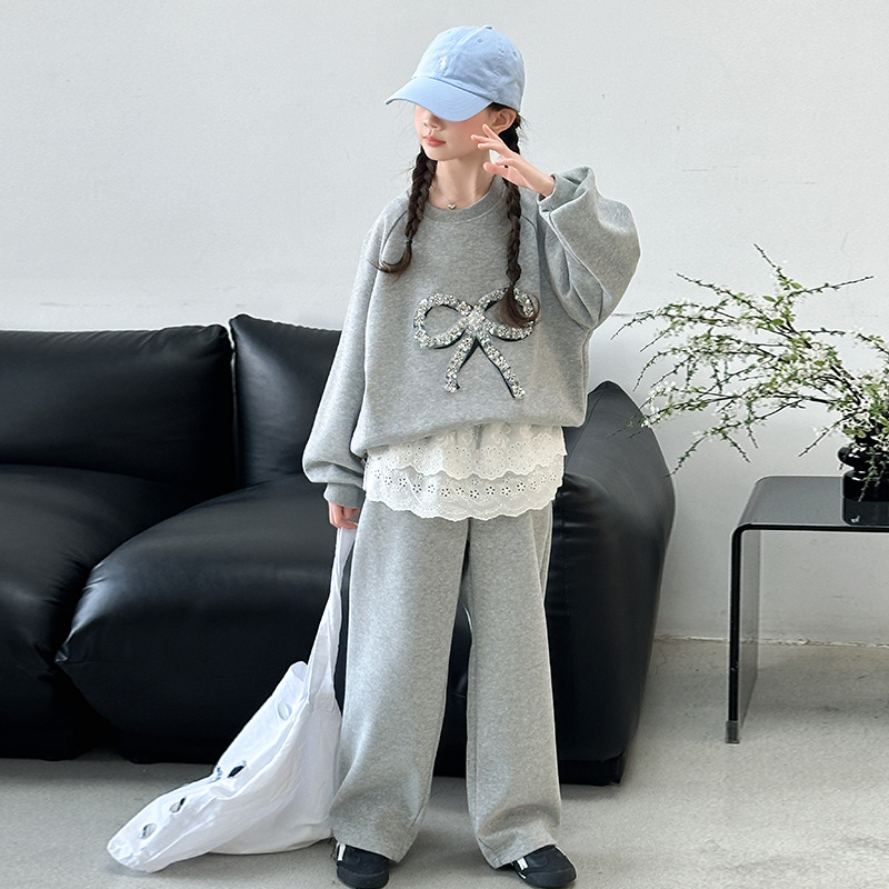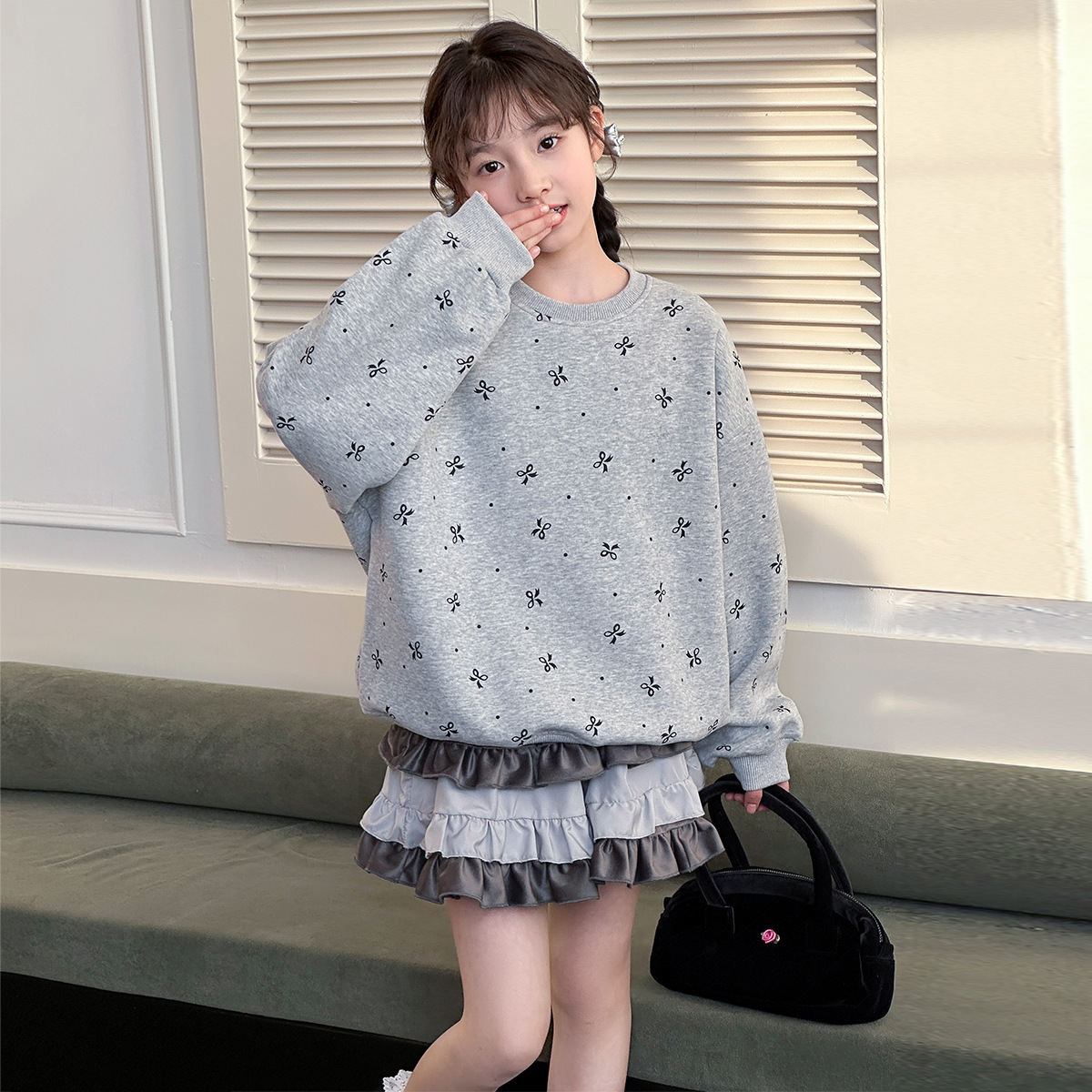 女の子の蝶結びの衛衣2025春の新型の大きい子供の韓国版の洋気の百合の丸首の長袖の上着のtシャツ