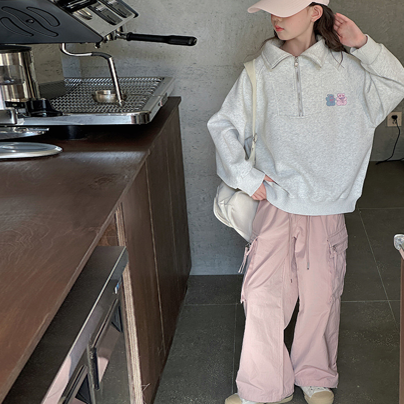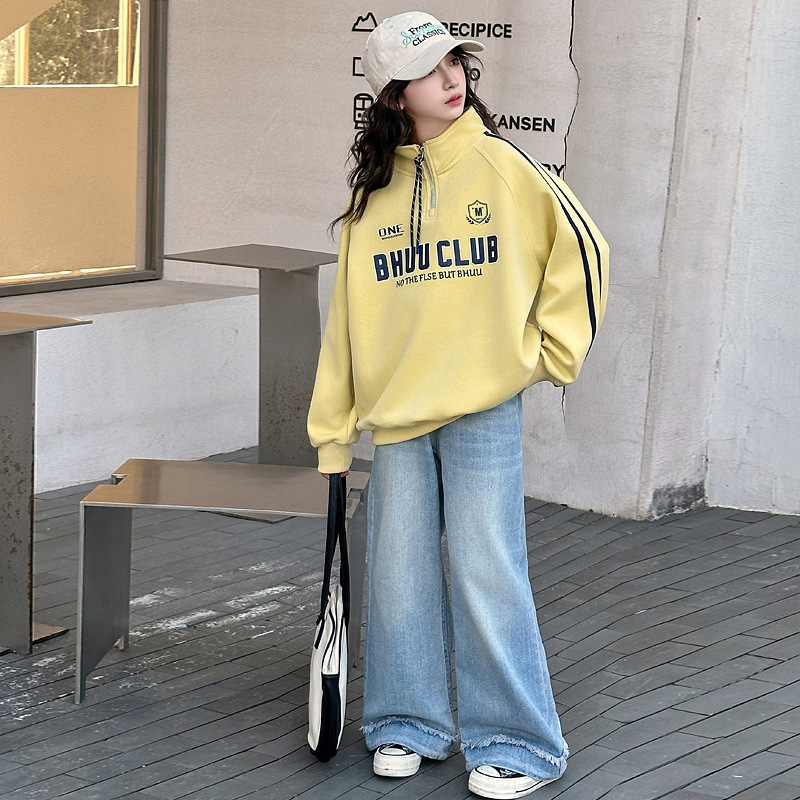 女の子の半ファスナーの衛衣2025春の新型の大きい子供の韓国版の洋気のファッションの簡単な百合polo上着のファッション