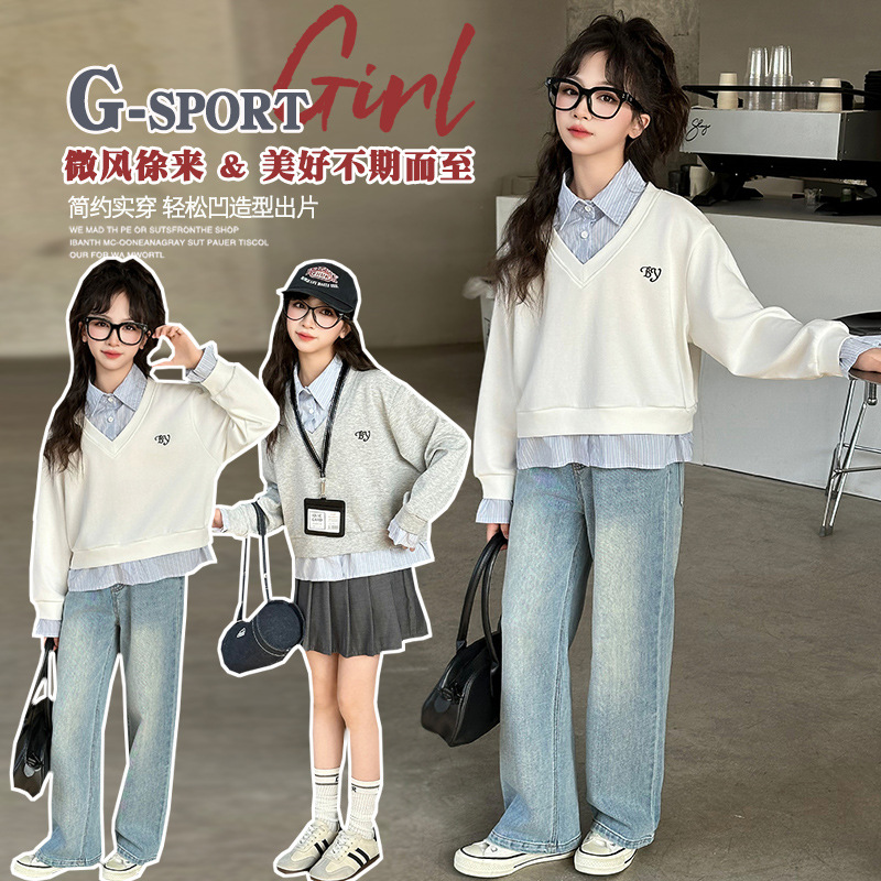 女の子の偽の2つのガードルのスーツ2025春の新型の大きい子供の韓国版の洋気の上着のジーパンの半スカートのスーツ