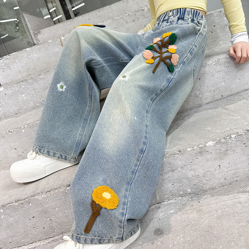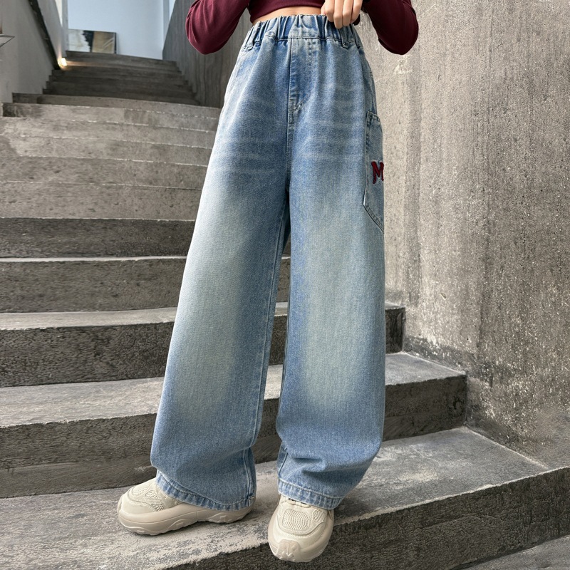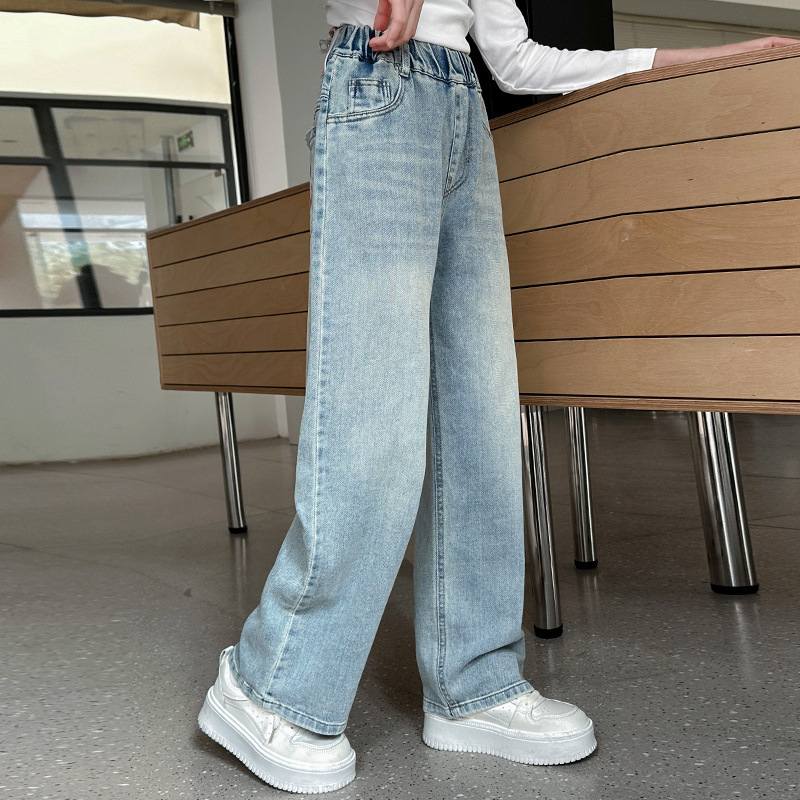 女の子のジーパン2025春の新型の大きい子供の韓国版の洋気の広い足のズボンのカジュアルな百合のストレートなズボンの外国貿易のズボン
