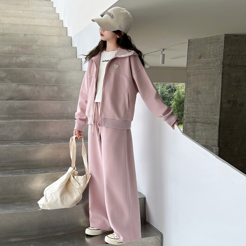 女の子のカジュアルスーツ2025春の服の新型の大きい子供の流行の洋風の半ファスナーのスウェットの運動服の2つのセット