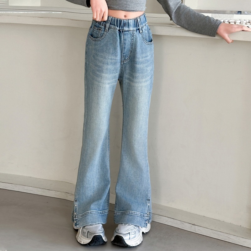 女の子の弾力性のデニムのラッパのズボンの2025春の新型の大きい子供のファッション的な洋風の百合の修身の小さいラッパのズボン