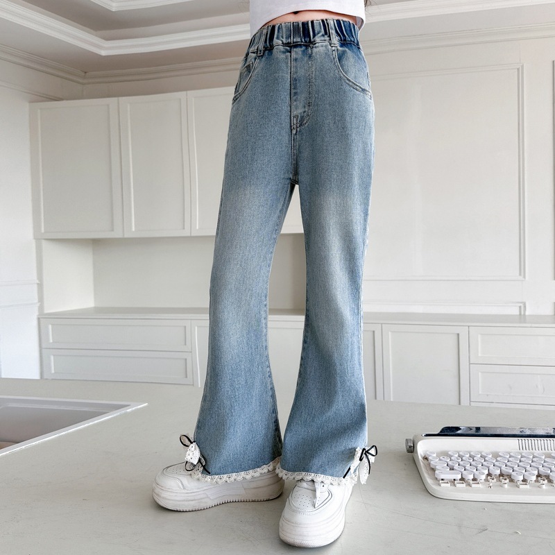 女の子のデニムのラッパのズボンの2025春の新型の大きい子供のファッションの洋風の百合の蝶結びの弾力の小さいラッパのズボン