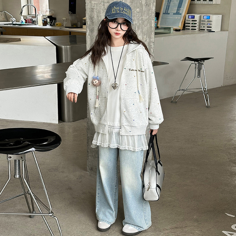 女の子の波点の衛衣のコート2025春秋の新型の女の子のファッションのカジュアルな帽子のコンビネーションのジーパンの2つのセット