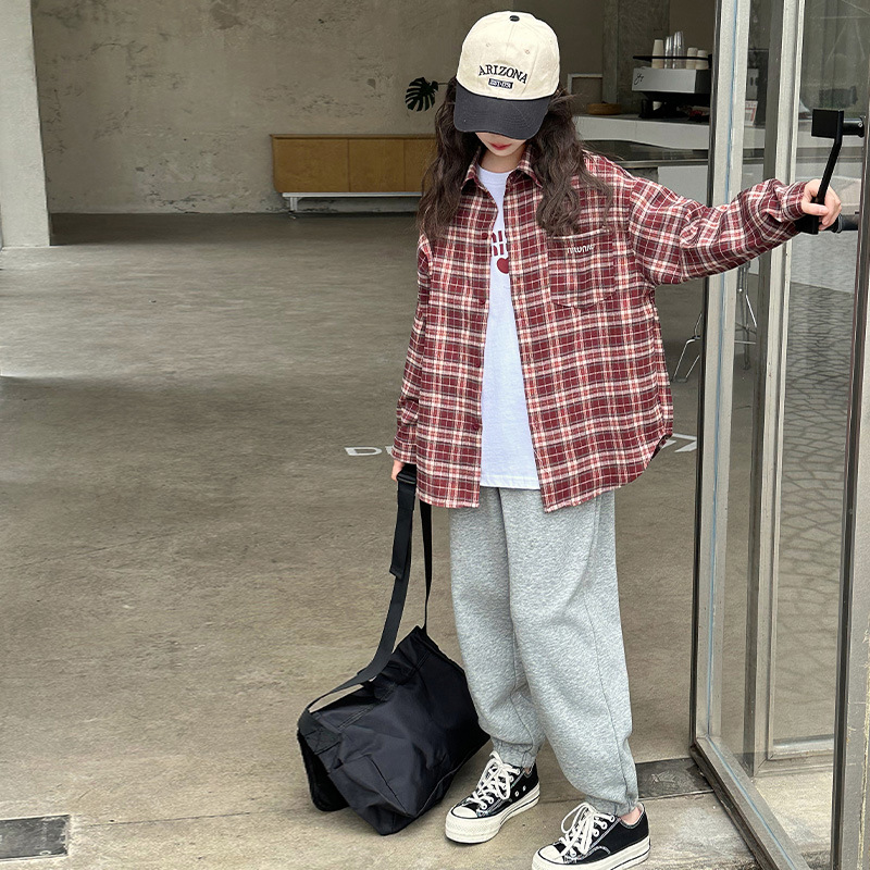 女の子春と秋の格子のシャツ2025の新型の大きい子供の韓国版のゆったりしているシャツの小さいシャツの子供の百合の薄いタイプのコート