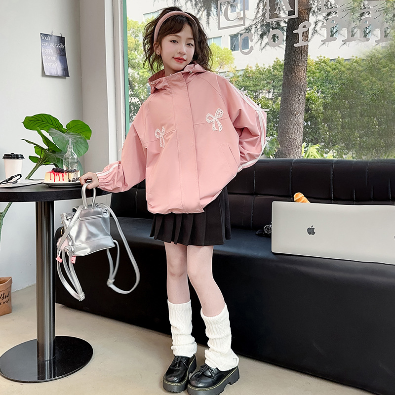 女の子の蝶結びのリボンのコート2025の新型の大きい子供の韓国版の洋気のカジュアルな帽子の突撃の服の春秋のジャケット