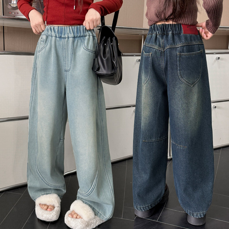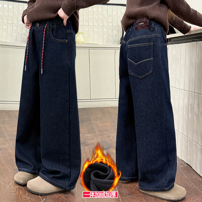 女の子のベルベットジーンズ2024秋冬の新しいワイドパンツの子供のファッション的な洋風のストレートパンツは、潮を厚くします