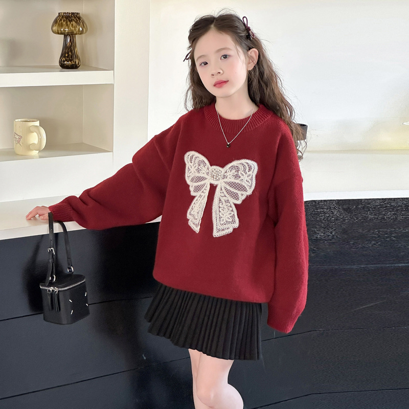 女の子の赤い年の代金のセーター2024秋冬の洋気の韓国版の百合の蝶結びのニットのセーターのセーターの上着