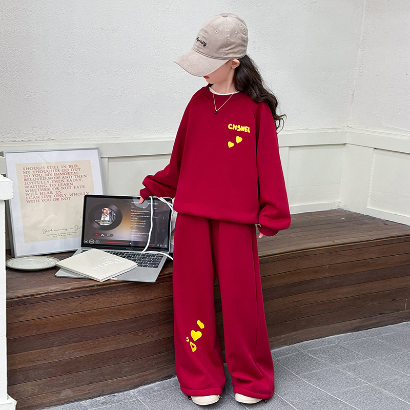 女の子の赤い愛の年服セット冬服2024新型洋気大童とベルベットの厚いスポーツ服2セット