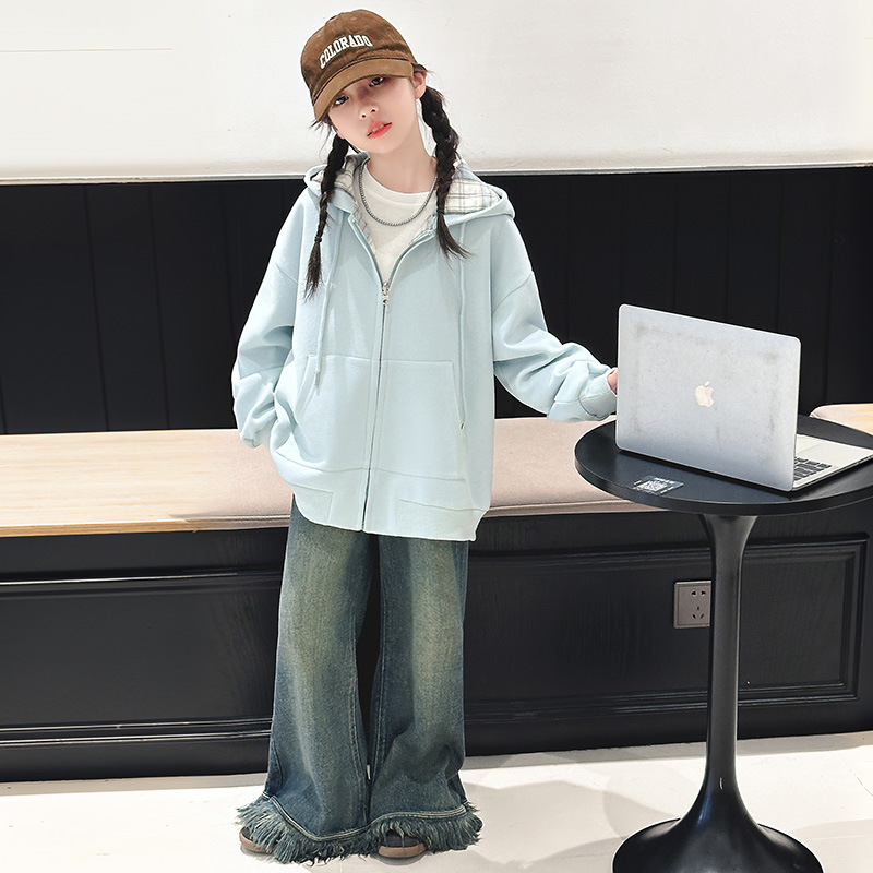 女の子カジュアルスーツ2025新型中大童春秋洋気馬甲連帽衛衣韓国版三点セット