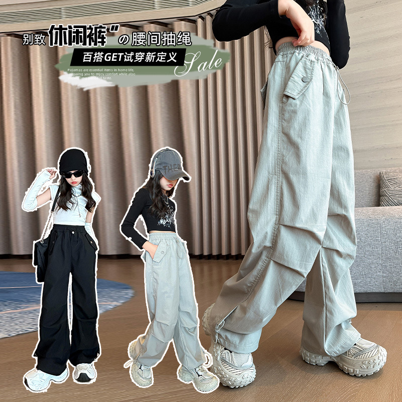 女の子の服装のズボンの春秋2025の新型の子供の洋気の流行の百合の広い足のズボンの傘の兵のズボンの大きい子供のカジュアルなズボン