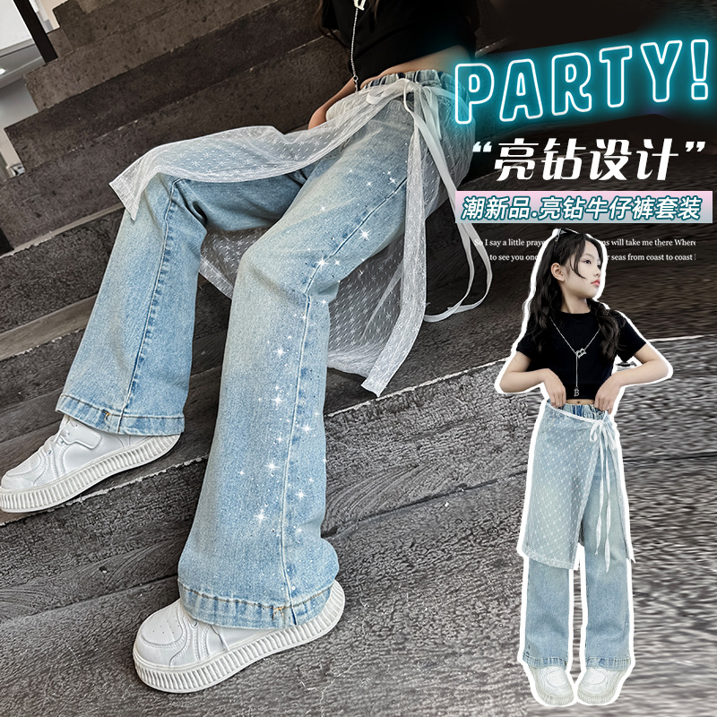 女の子の春秋タイプのジーパン2025の新型の大きい子供のファッション的な洋風の百合の曲がった刀のズボンの子供のカジュアルな広い足のズボン