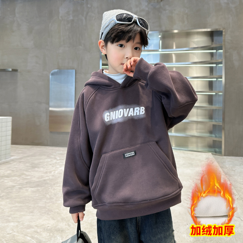 男児とベルベットの帽子付きのガードル2024冬の新しい子供の韓国版のゆるい洋気がクールな男の子の上着を厚くする